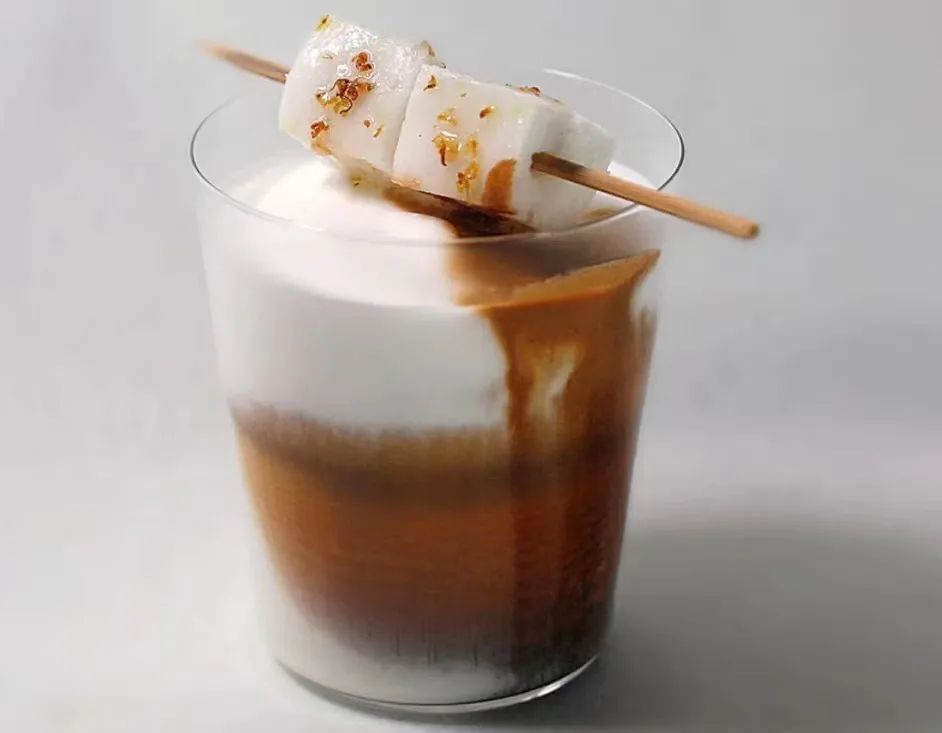 “西湖拿铁” 的特调,浓缩咖啡+鲜牛乳作为拿铁的基础,最后再穿一串桂花糕点缀,底层加入了甜酒酿,补充了一种奇妙的酒香甜感。