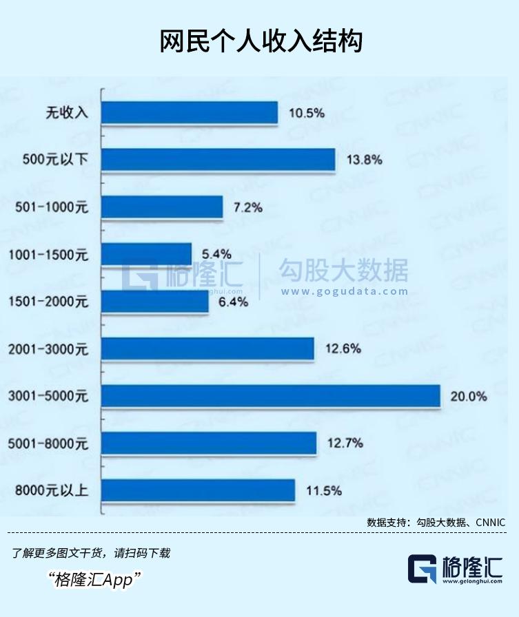据CNNIC统计调查,全国网民的月收入,88.5%在8000元以下,其中收入3000元以下的占比高达55.9%。