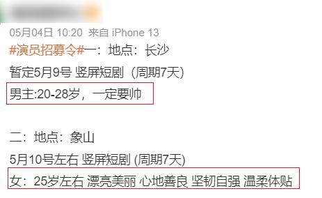 这还是比较精细的,还有很多公司的演员招募信息更为简单粗暴:演表姐夫,要求看上去不能是个没钱人,毕竟是在银行工作的;演校草男,不要丑;演反派女主管,要绿茶、雌竞。