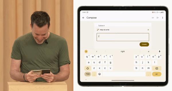 大会现场,我们看到谷歌官方还在Pixel Fold上演示了Gmail的自动邮件生成功能。