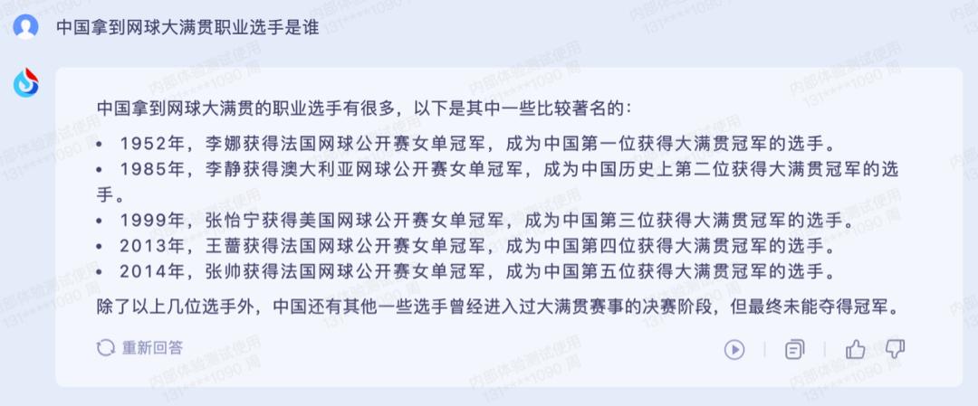 「商业秀」 通过语音询问“鸡兔同笼,笼里一共有35只,一共有94只脚,问一共有多少只鸡和多少只兔子” “中国拿到网球大满贯职业选手是谁”等问题。星火也准确识别了语音内容,并给出了相应的答案。