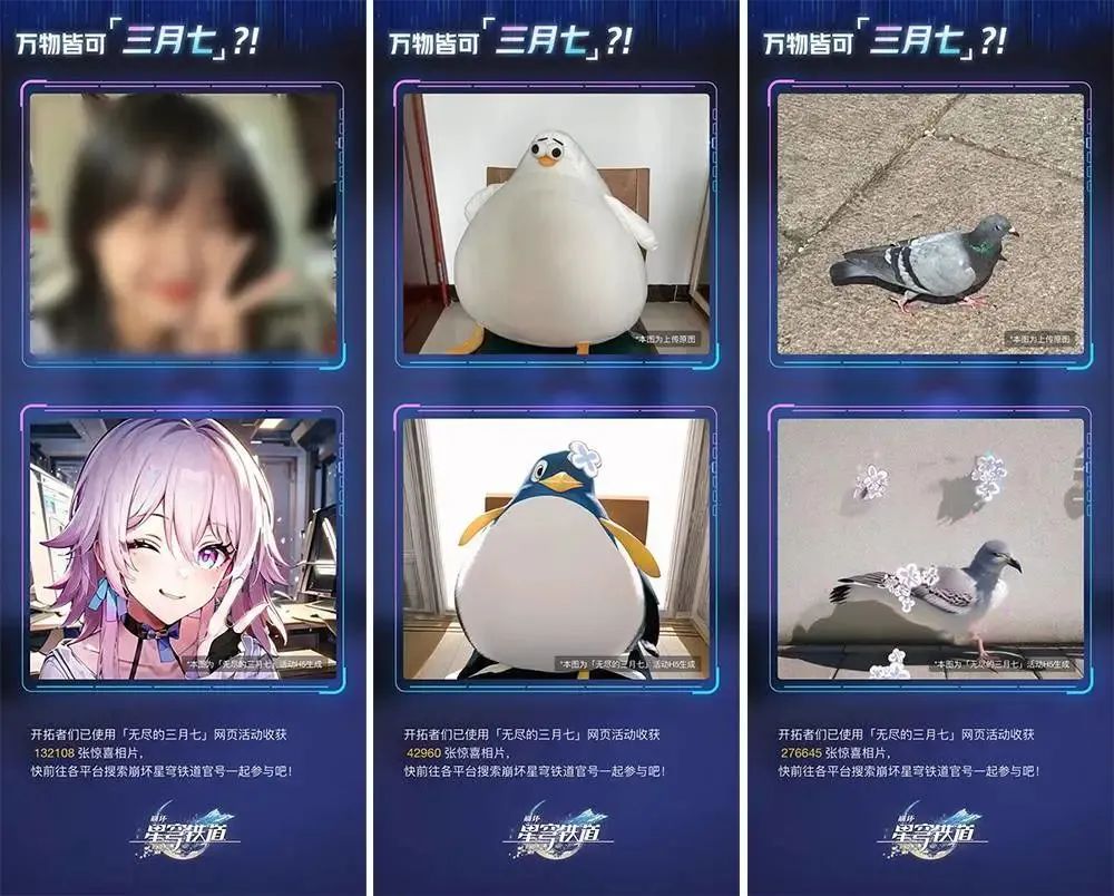 他们给我展示的是一个名为「万物皆可三月七」的创作活动——只需上传一张照片,系统就会生成一张做着相同动作的游戏内角色「三月七」,