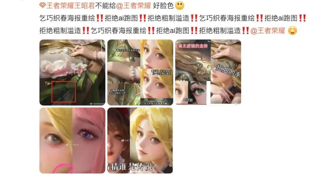 今年 3 月,王者荣耀推出新皮肤,不少玩家发现游戏原画有 AI 作画的嫌疑,直到今天,我们依然可以在社交媒体上看到「拒绝 AI 跑图」的声音。