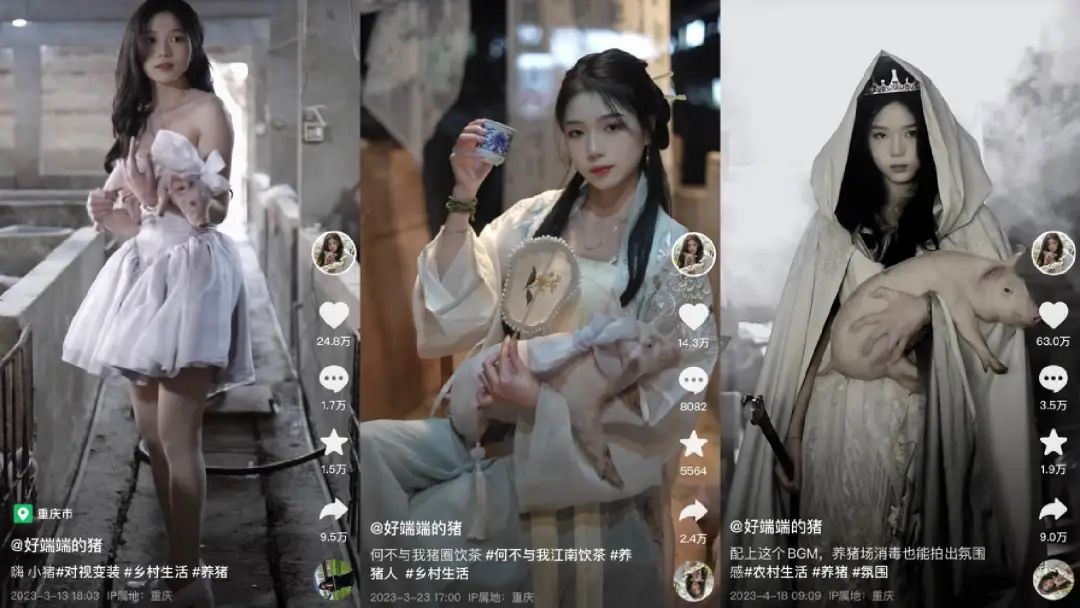 只见她上一秒还在衣着朴素地喂猪,下一秒就变成身穿白色抹胸裙的“在逃公主”、惬意饮茶的汉服少女、《威廉古堡》中的女巫……唯一不变的是,怀里永远抱着一只小猪仔。