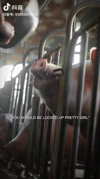 只见一个西部牛仔风装束的女生走进养猪场,卡着BGM鼓点用盆子敲打探出栏杆的猪鼻子,然后优雅地撒上一把猪粮,同时镜头再给猪惊恐的小眼神、流口水的动作来个特写。最后,女生对着镜头露出三分讥笑三分薄凉四分漫不经心。