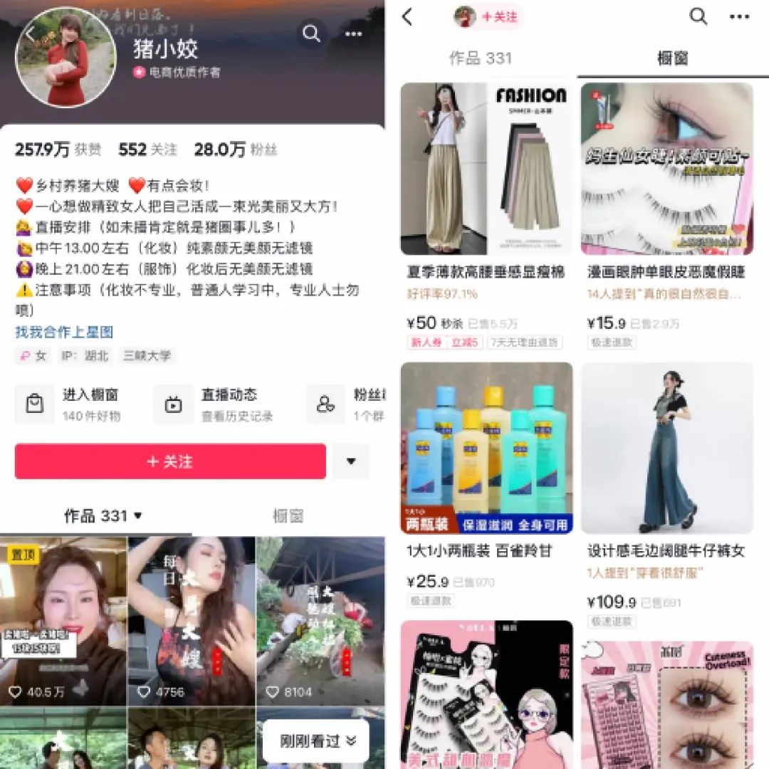 同为养猪博主的“猪小姣”已经通过橱窗和直播开始带货美妆产品、女装和零食。