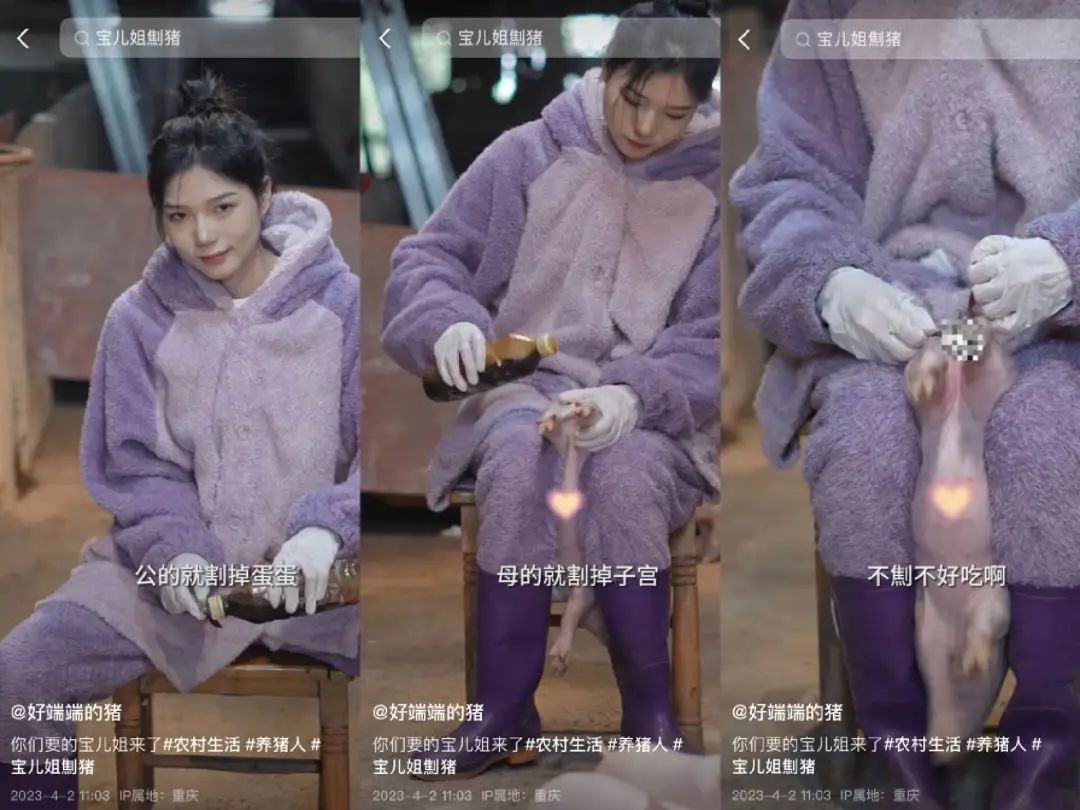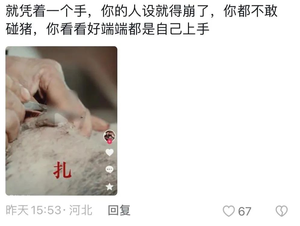 也因此,一些网友将她与“好端端的猪”进行对比,更有细心的网友发现,该博主劁猪视频中的手明显不是她本人的,表示人设还没立起来就已经崩了。
