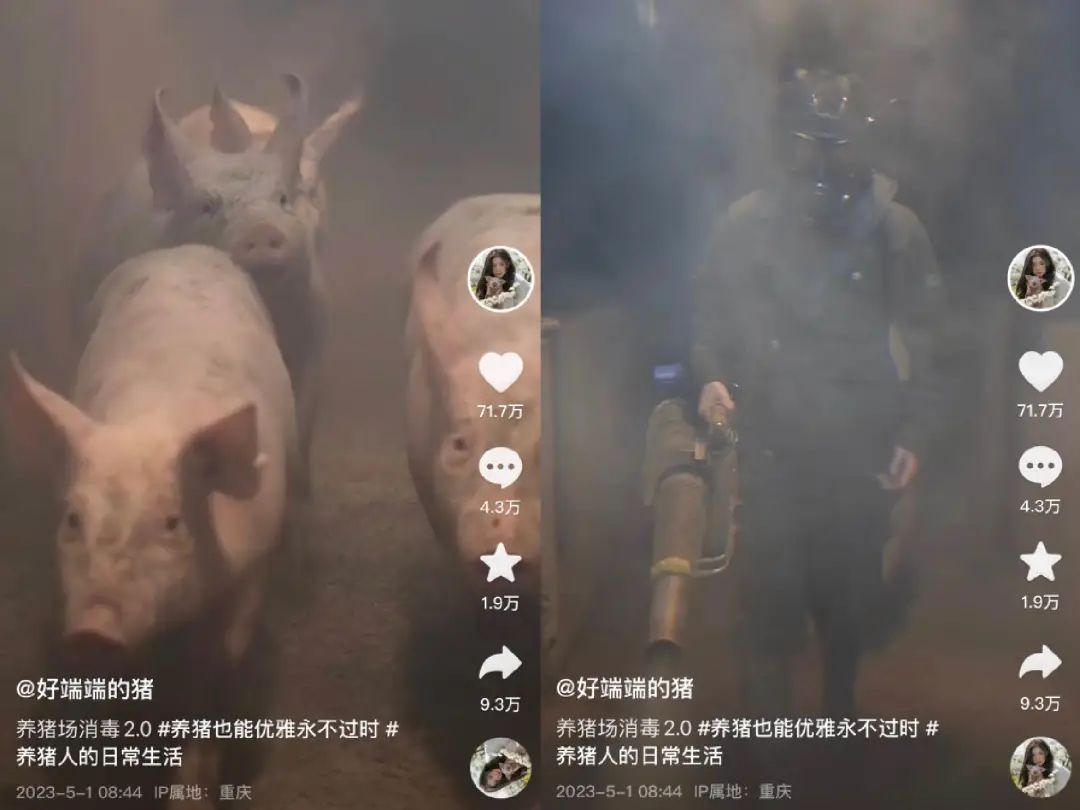猪猪们向着前方仓皇逃窜,身后的端端手持冒着幽蓝火焰的雾化机,头戴防毒面罩从烟雾中走出……再配上富有压迫感的音乐和卡点变速,猪场消毒硬生生被拍出“生化危机”末日大片的即视感。