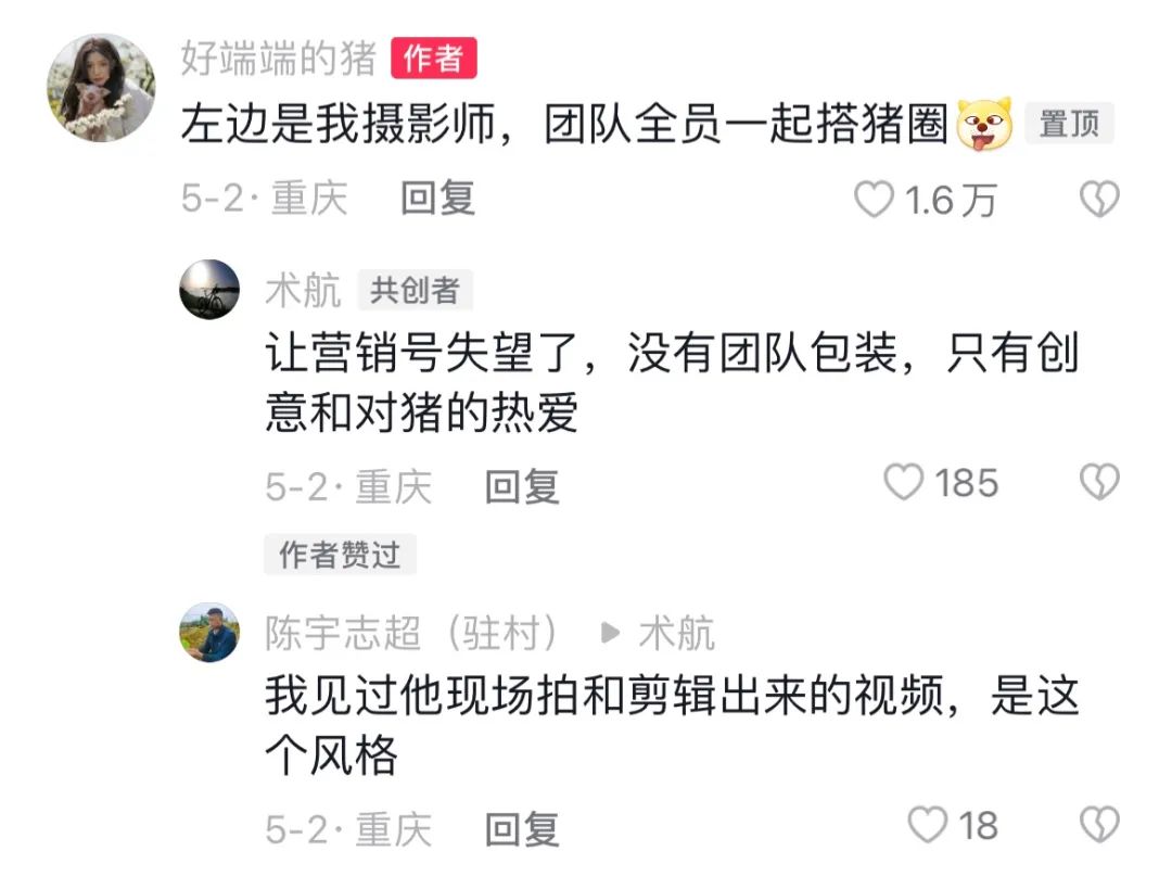 5月2日,“好端端的猪”发布了一条共创视频,提到一个摄影师账号“术航”,并在评论区表示“是我摄影师,团队全员一起搭猪圈”。“术航”也评论道:“让营销号失望了,没有团队包装,只有创意和对猪的热爱”。目前,“好端端的猪”的关注列表里也只有“术航”和“人民网”。
