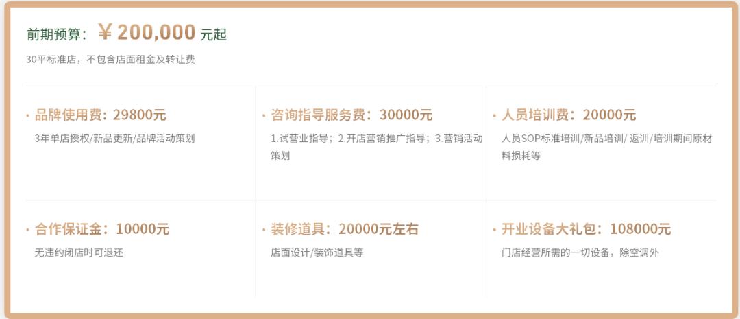 锌刻度留意到,茉酸奶的30平标准店加盟费用为200000元起,其中品牌使用费为29800元、咨询指导服务费为30000元、人员培训费为20000元、合作保证金10000元、装修道具为20000元左右、开业设备大礼包108000元等。
