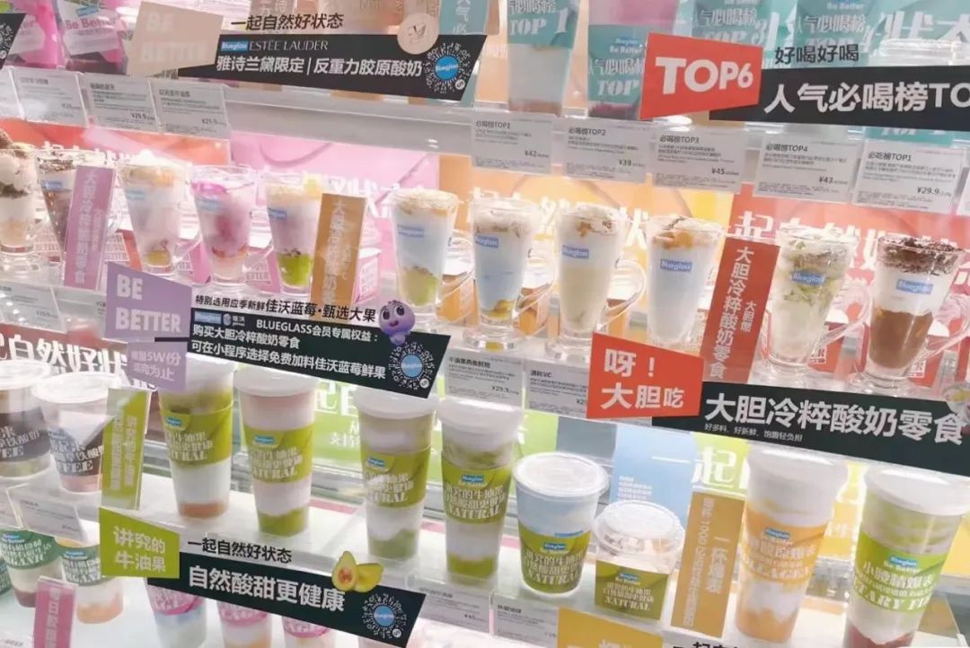 除了lululemon,Blueglass还在近期频繁联名,其中联名美妆护肤品牌雅诗兰黛,推出了“反重力”胶原酸奶系列,联名佳沃蓝莓推出 “花青素胶原女孩酸奶系列”,并推出了北京、上海、深圳多地的限定佳沃蓝莓主题门店打卡活动。