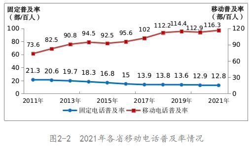 在过去十年中,全世界的固话逐渐被移动电话所取代。想想你自己上一次使用固话是什么时候,就能直观感受到这种趋势。在我国,固定电话普及率从2011年的21.3部/百人下降到2021年12.8部/百人,也就是说如今只有大约十分之一的人还在使用固话。