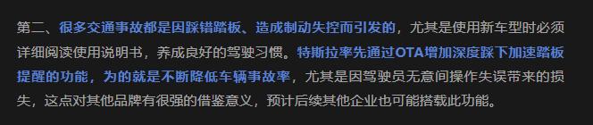 —— 这直接点出了特斯拉过去几年以来在中国卖车,默认开启最高的动能回收,并且不给车主以简单方便的调整回收强度或完全关闭回收功能的方法;并且这样的功能让用户养成了总在“地板油”的坏习惯,同时却严重缺乏对刹车踏板的使用经验——造成了严重安全隐患。