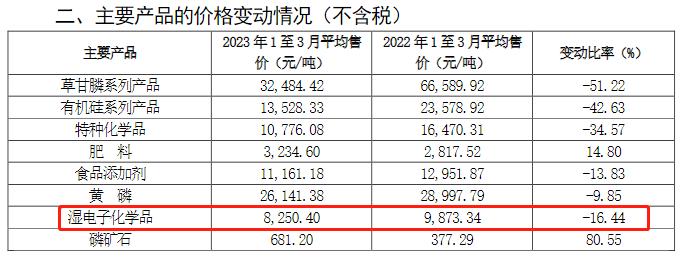 但是兴发集团另一则公告显示,湿电子化学品2023年第一季度平均售价为8250.4元/吨,相较2022年第一季度的9873.34元/吨下降了16.44%。