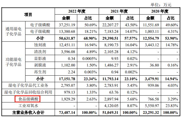 申报稿显示,兴福电子在生产电子级磷酸、电子级硫酸的同时会产生部分食品级磷酸、工业级硫酸等产品。其中2022年食品级磷酸的主营业务收入为1929.29万元。