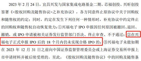 另外,兴福电子间接控股股东还与第二大股东有可复活的对赌协议。且其中一条比较少见,即在兴福电子正式申报IPO后的18个月内仍未实现合格IPO的。