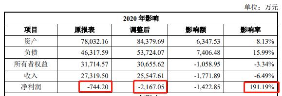 这里有三个看点。一是,兴福电子2022年12月进行过前期会计差错更正及追溯调整,比如兴福电子原报表2020年净利润为-744.2万元,调整后为-2167.05万元,变动不小。