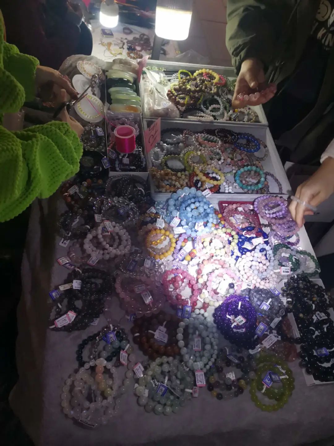 4月初,燃次元来到潘家园内,某个摊位上,折叠桌上并排摆着两个不小的收纳盒,盒子里是五光十色的珠串,桌子左侧夹着的台灯堪堪照亮摊位不足三分之一的商品。