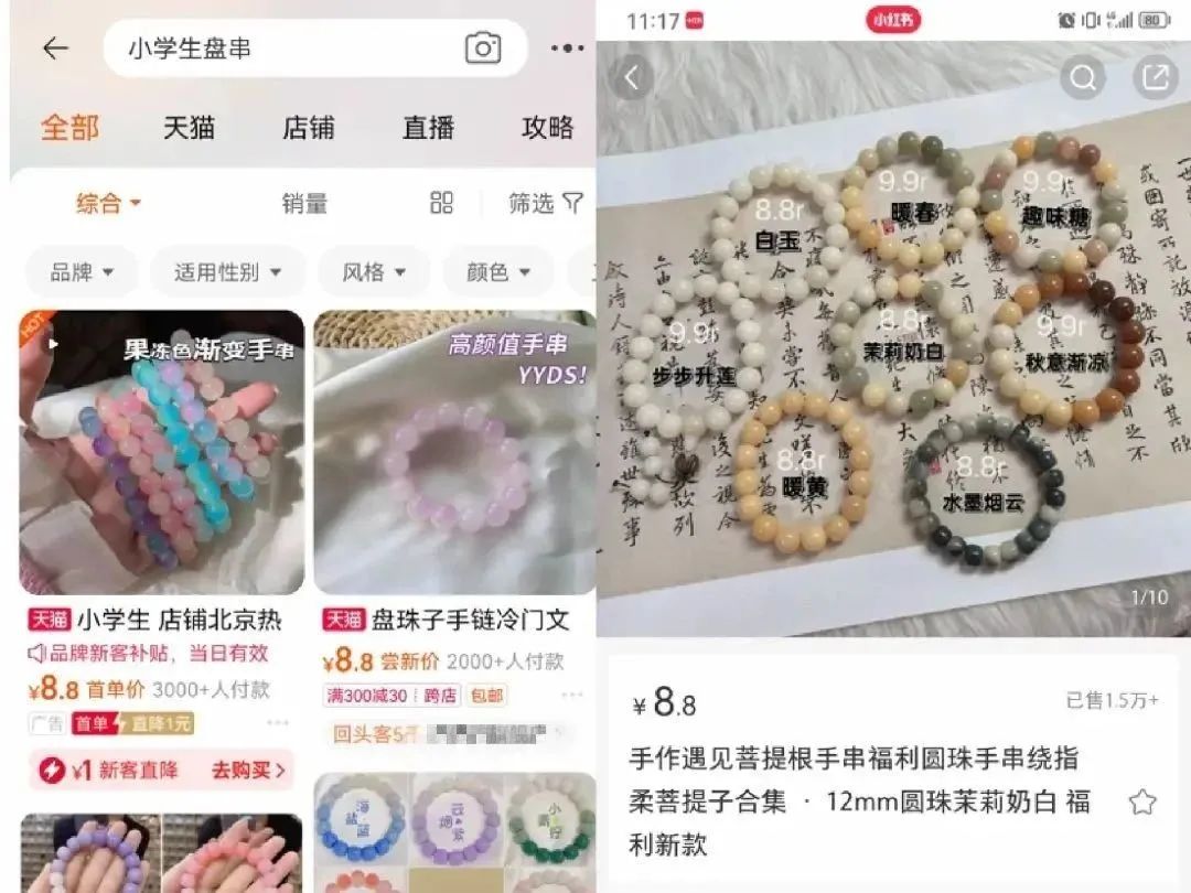 在小学生的盘串热情下,商家们闻风而动。不只是学校附近的小卖部店主,在淘宝、小红书等平台,做起小学生盘串生意的商家也不胜枚举。