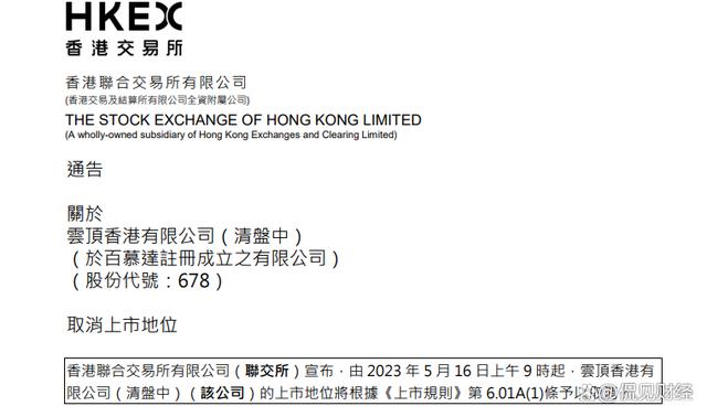 5月11日,港交所宣布,自2023年5月16日上午9时起,云顶香港(00678.HK)的上市地位将根据《上市规则》第6.01A(1)条予以取消。