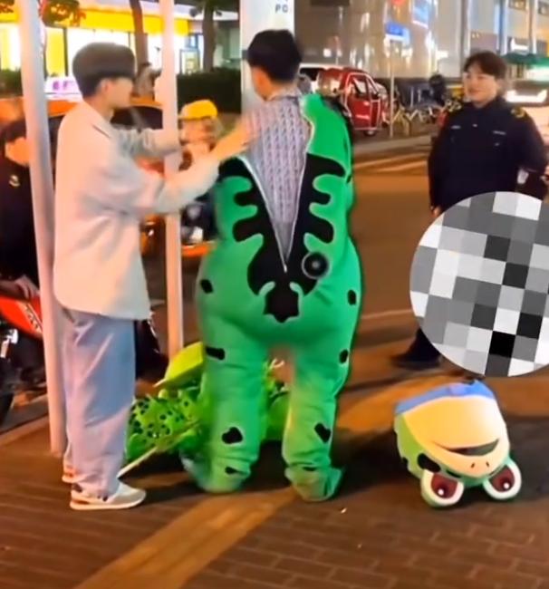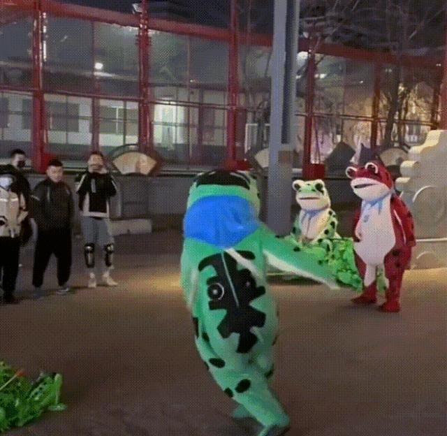 深夜里,有网友在人群散去后,见到一只“蛙”坐在路边摘下头套,一位朋友帮他从后背拉开蛙皮上的拉链,他的头发被汗水浸湿,整个人像被捞上岸很久的鱼。