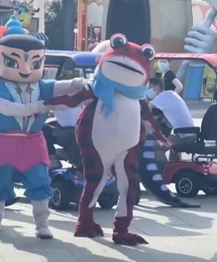 有人和爷爷去公园遛弯遇到“青蛙”,以为蛙头里是什么可爱的年轻人,结果摘下头套一看,里面也是个老爷爷。