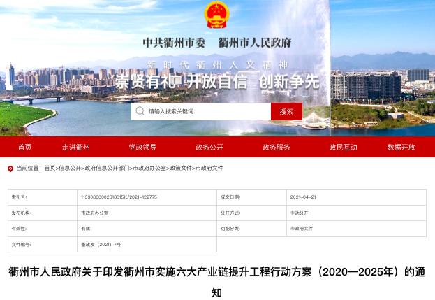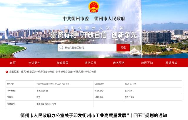 《衢州市工业高质量发展“十四五”规划》指出,衢州以打造六大标志性产业链为核心,聚力做强新材料产业,全力做大高端装备、电子信息、新能源、生命健康四大新兴产业,全面提升特种纸、绿色门业家居、新型建材、金属制品四大传统特色产业,着力构建“1+4+4”现代产业体系,加快布局量子信息、基因技术、未来网络等。