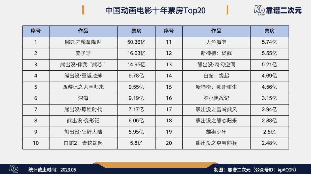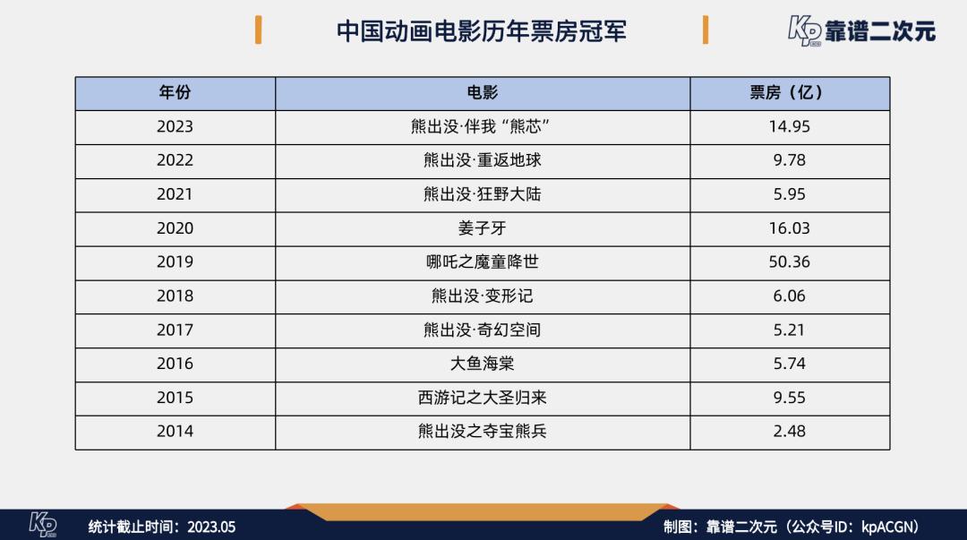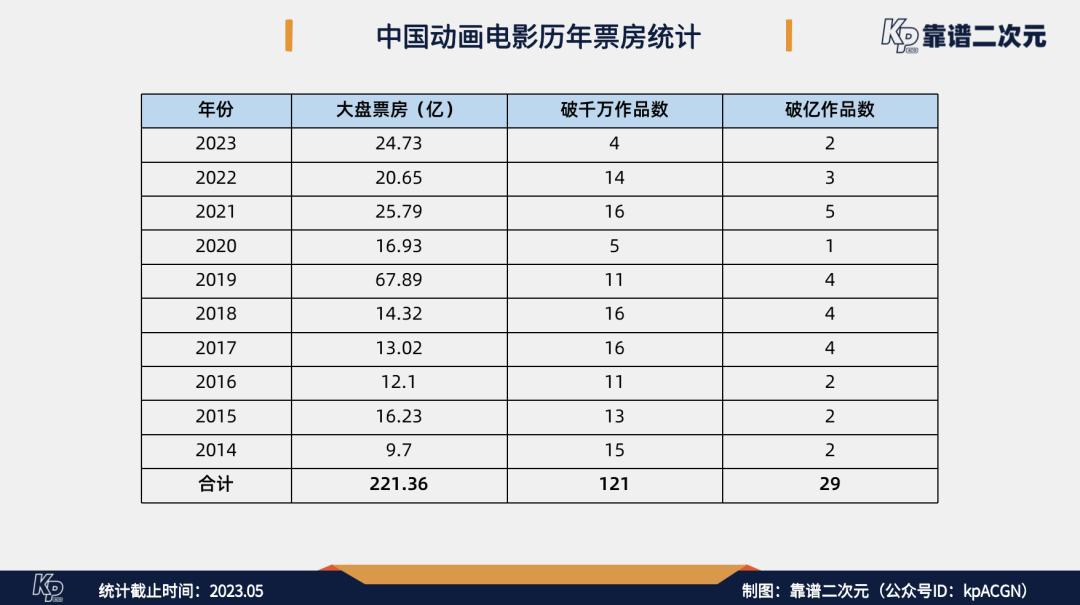 那么,时至2023年,中国动画电影还值得期待吗?在得出结论之前,靠谱二次元(公众号ID:kpACGN)盘点了2014年-2023年5月近10年共计121部票房破千万的中国动画电影,试图从中观察产业的发展规律,也期望通过结合市场现状和产业从业经验,分析当下中国动画电影的困境与机遇。