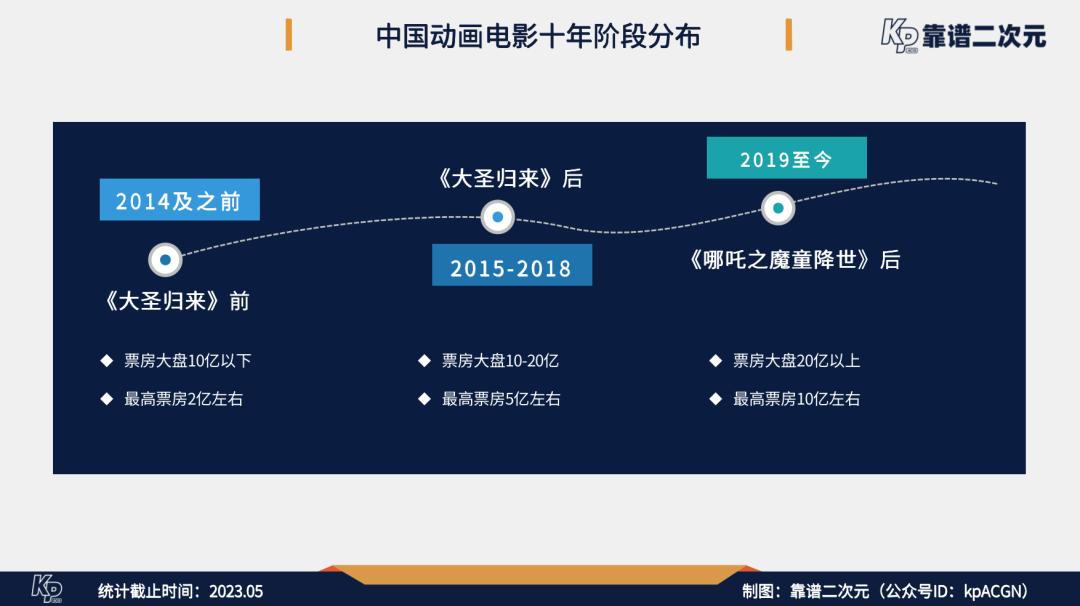 从2014年到2023年5月14日上映的共计121部票房破千万的中国动画电影作品来看,近十年中国动画电影大概分为三个阶段,即《大圣归来》前(2014及之前)、《大圣归来》后(2015-2018),《哪吒之魔童降世》后(2019至今)。可以说《西游记之大圣归来》和《哪吒之魔童降世》这两部作品对中国动画电影整体票房大盘、年度动画电影最高票房产生了节点式的影响,真实地开拓了动画电影市场,为产业吸引了一批新消费者。