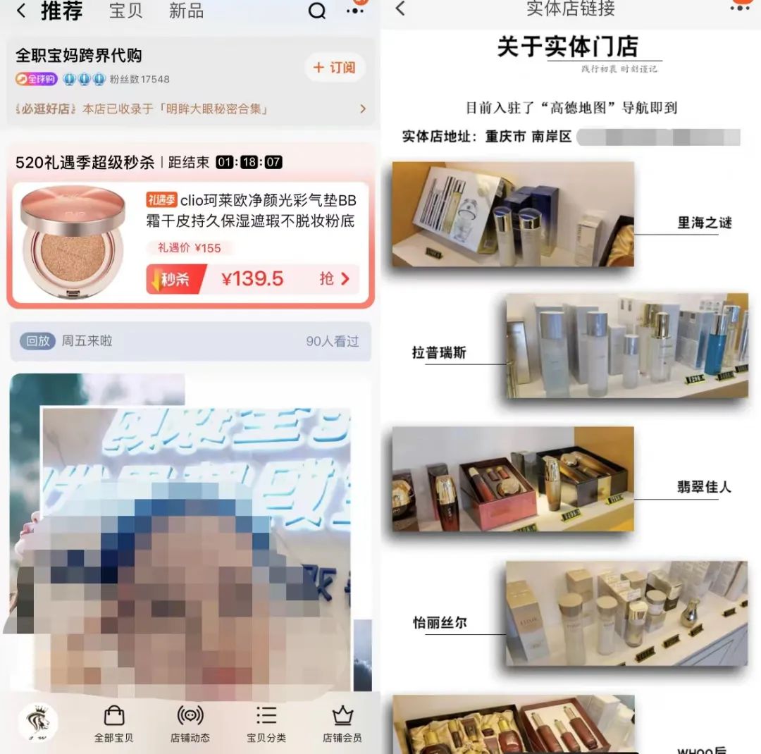 据了解,淘宝店铺“全职宝妈跨界代购”为淘宝三皇冠店铺,粉丝数为17548,店铺详情页显示其在重庆市南岸区也开设有实体门店,销售品牌包括里海之谜、拉普瑞斯、翡翠佳人等。