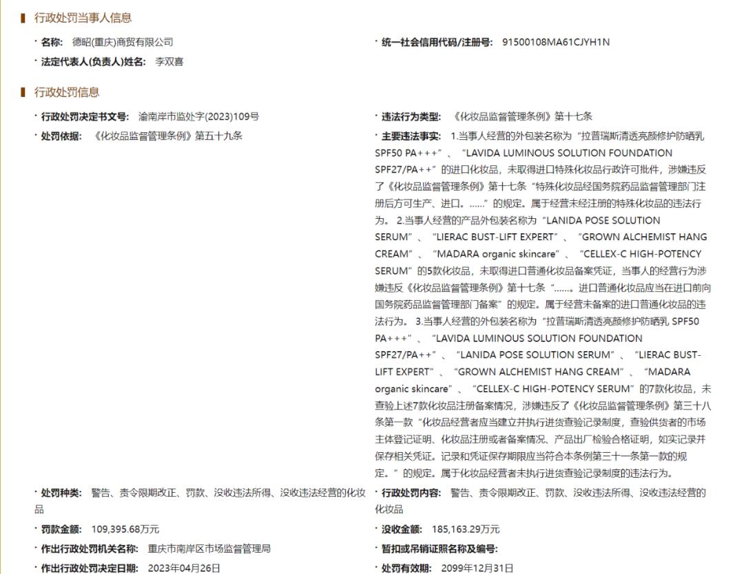 最终,重庆市南岸区市场监督管理局依据《化妆品监督管理条例》第五十九条,对该公司做出警告、责令限期改正、罚款、没收违法所得、没收违法经营的化妆品,合计罚没款29.4亿元。