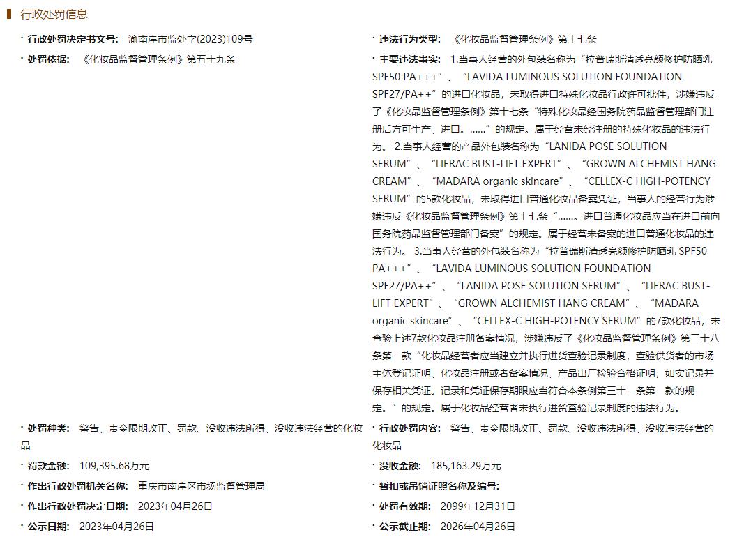 国家企业信用信息公示系统显示,德昭(重庆)商贸有限公司(以下简称德昭商贸)被重庆市南岸区市场监督管理局处以没收18.52亿元,罚款10.94亿元的行政处罚,处罚时间为今年4月26日。德昭商贸违法经营的化妆品主要涉及拉普瑞斯(LaPulovce)等品牌。