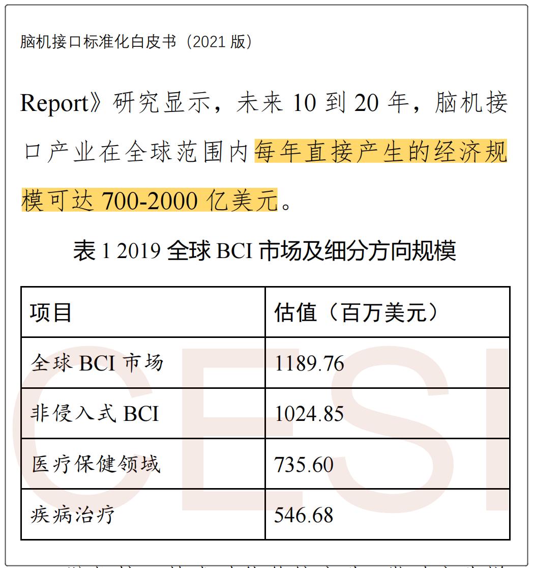 据中国电子技术标准化研究院公布的《脑机接口标准化白皮书2021》(以下简称“《白皮书》”)预测显示,脑机接口技术(Brain Computer Interface,BCI)潜在市场很快将达数百亿元。