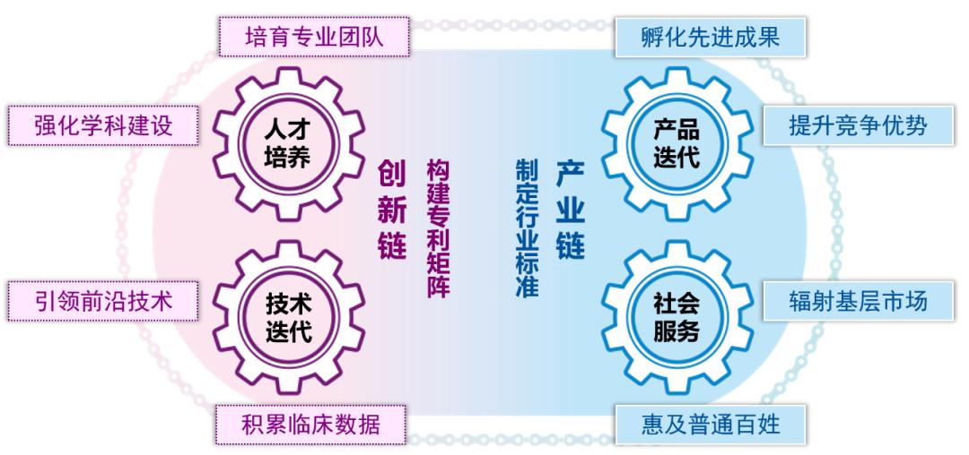 对此,段峰规划出了创新链和产业链双循环战略,即由实验室引进、吸收前沿技术,与企业合作孵化先进成果,把科研成果转变成产品,通过国产替代降低产品价格。产品从三甲医院下沉,辐射到基层医院或社区卫生所,实现普惠后,可以得到大量临床数据,反过来可以帮助科研团队研发更加前沿的技术,助力学校加强学科建设,培养专业的人员团队继续为产业储备新的科研成果。