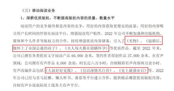 5月16日一则上市公司年报是在朋友圈疯传。上市公司“平治信息”在年报中分析移动阅读业务时这样描述:“2022年公司不断加强和出版机构、媒体和个人作者等版权方的合作,持续增强优质内容储备,引入了《尤物》、《退婚后,她怀上了帝国总裁的孩子》、《夫人每天都在隐瞒怀孕》等优质作品。”