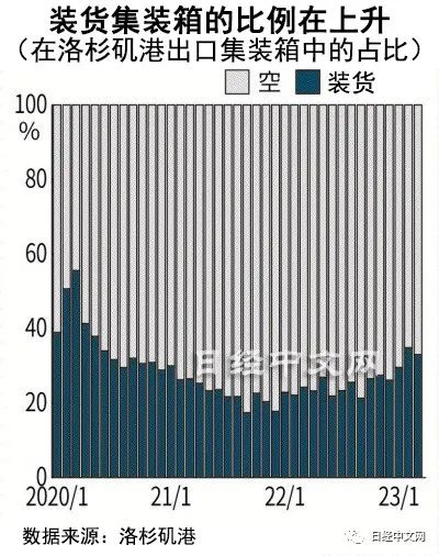 北美最大港口洛杉矶港的数据显示,在3月出口的集装箱中,装载货物的集装箱比例为33%。继2月达到35%之后,已连续两个月超过30%。这是2020年5~6月以来的最高水平。虽然不及比例达到4成左右的2019年,但以作为主力的亚洲航线为中心,2022年下半年以后呈现出增加趋势。