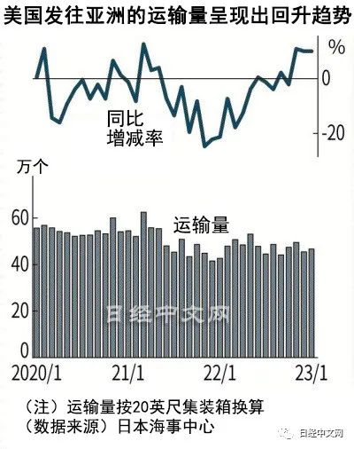 据日本海事中心称,1月美国发往亚洲的海上集装箱运输量为46万6945个(按20英尺集装箱换算),同比增加9.4%。虽然有上年运输量基数较低的原因,但自2022年11月起,已连续3个月超过同比增加。据大型集装箱船公司称,目前运输量仍在继续回升。