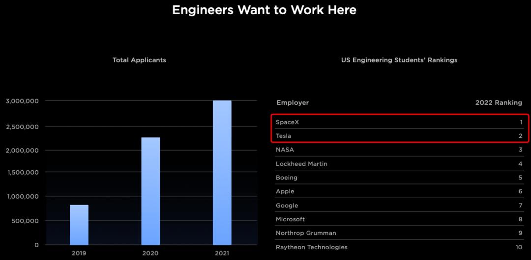 2022年特斯拉共计收到了全球360万份求职申请,马斯克直言“SpaceX和特斯拉是全球工程师最想去工作的两家公司。