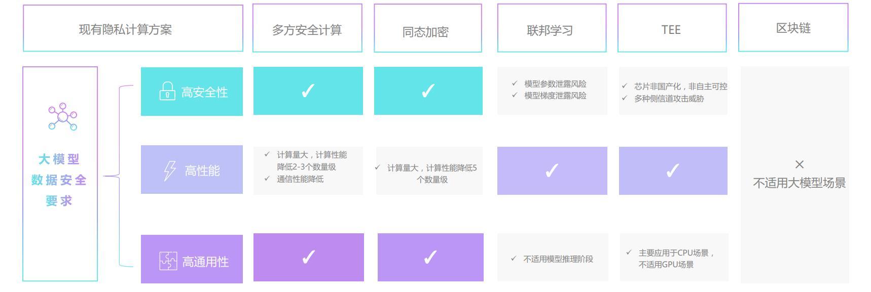 不过,随着大模型厂商增加, 相关的数据安全赛道却几乎是一片空白——大模型的安全计算是一项涉及千亿级参数的计算,而现有的隐私计算方案并没有办法同时满足大模型场景下的高安全性、高性能、高通用性的保障要求。 比如,同步加密的方法在使用的过程中可能将计算性能降低五个数量级, 联邦学习不适用于模型推理阶段等等。基于安全多方计算的方案是现有隐私计算方案当中最有可能在大模型领域应用落地的技术。