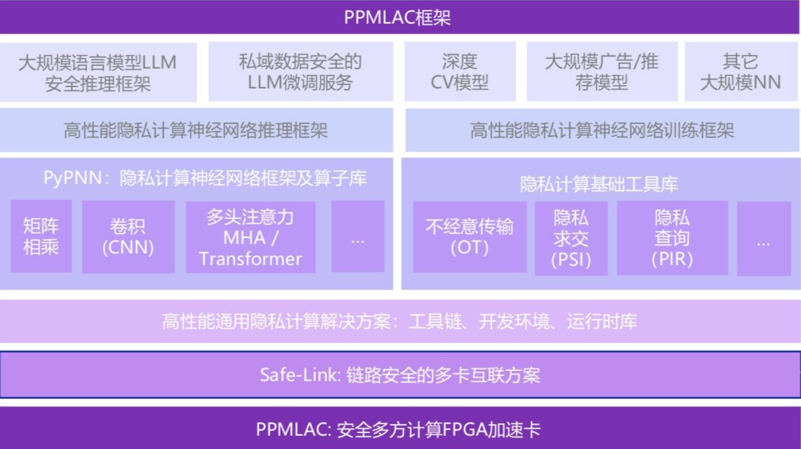 据其介绍,在保证数据安全的前提下,基于独创的芯片设计,该方案可以将隐私计算性能与明文计算性能差距缩小到一个数量级以内,并可应用于模型微调和推理环节。
