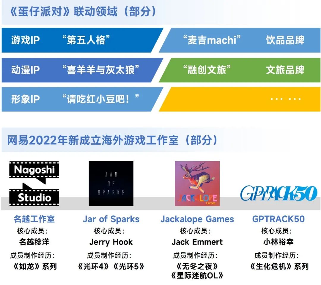 2022年网易在国内与海外的IP布局均取得了显著的阶段性成果。在国内市场,网易推出了休闲游戏《蛋仔派对》并成功推动其IP化发展,产品在设计上与盲盒进行强关联,有效提升了与各类IP的兼容性,为后续广泛的IP联动奠定了基础;同时盲盒扭蛋形象本身也有利于未来IP实体衍生品的拓展研发,截至2023年2月,《蛋仔派对》最高日活用户数已超过3000万。在海外,网易积极加强与海外知名制作人的合作,投资了数家日本、美国等海外地区的国际知名游戏制作团队,同时于2022年相继成立多家海外游戏工作室。通过与国际知名游戏制作人的深度合作,持续拓展网易全球化IP打造能力。