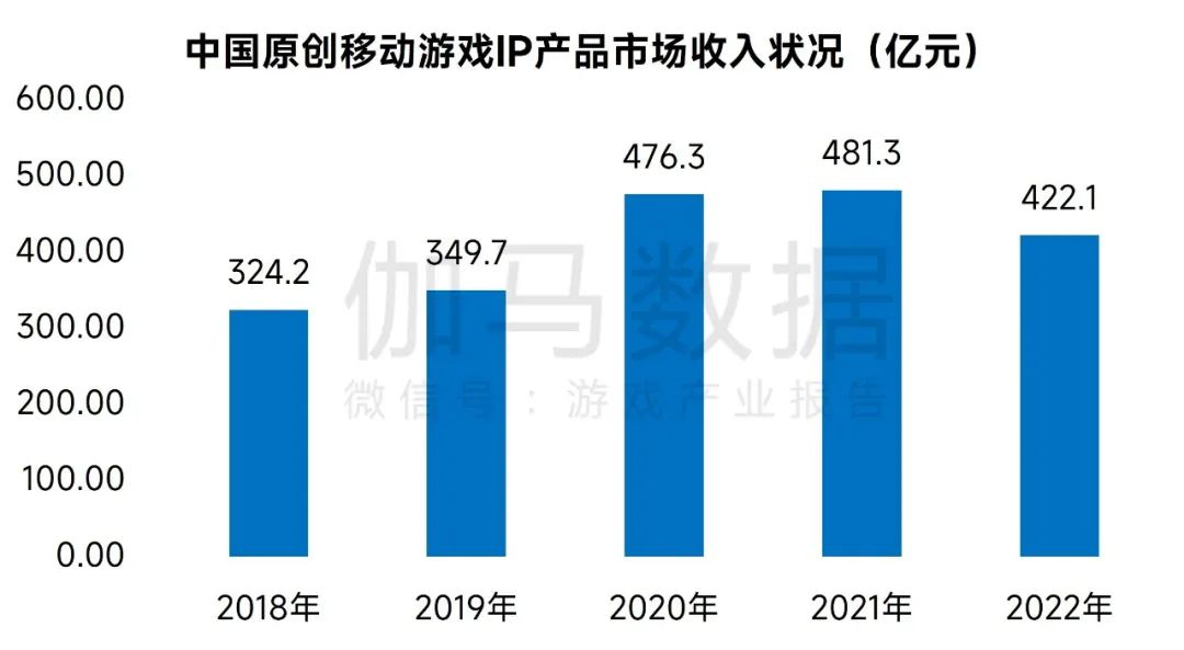 在原创移动游戏IP方面,2022年我国原创移动游戏IP产品市场收入422.1亿元,一方面在2020年至2021年间推出的移动游戏原创IP数量较往年更多,而随着产品生命周期的推进,部分产品流水出现自然下滑;另一方面是因为2022年移动游戏原创IP领域缺乏头部产品,难以对市场形成有效支撑。