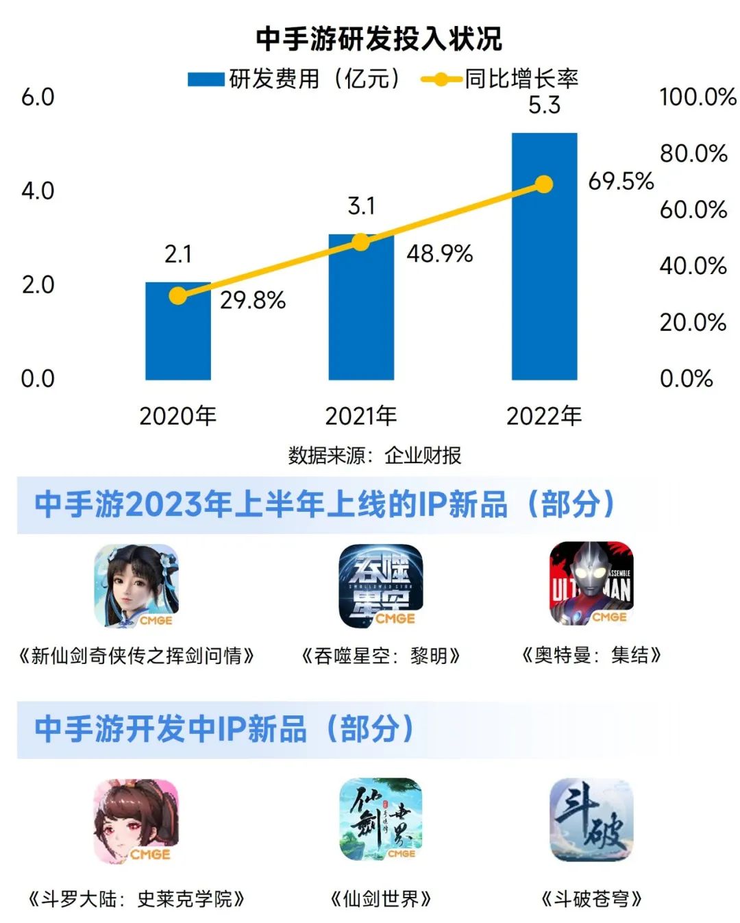 随着中手游对全球市场投入的加码,旗下IP产品在多个国家与地区取得了亮眼成绩,其中《新射雕英雄传之铁血丹心》《斗罗大陆:斗神降临》《全明星激斗》等多款产品跻身当地游戏排行榜TOP5。中手游结合自身IP文化属性特征,重视挖掘游戏产品本身的文化价值,在游戏玩法和运营层面,和中国文化主题深度融合,培养大众艺术欣赏能力,助力国风文化在全球范围的传承。中手游以东南亚等中国文化影响深远的地区作为出发点,顺利将IP引入当地市场,在丰富IP变现渠道的同时,也进一步提升了IP全球影响力。在IP储备方面,截至2022年末中手游共有55个授权IP与68个自研IP储备,为公开IP数量的中国游戏企业中IP储备量最多的游戏企业,丰富的IP储备结合中手游自身IP运营及产品开发经验,保障了中手游长期变现能力。财报资料显示,中手游已有多款IP改编新品获批版号并计划于2023年内上线,随着IP布局的落地,企业将获得新的营收增长点。在研发端,中手游持续加码研发投入,2022年研发支出5.3亿元,同比增长69.5%,凭借不断增强的研发实力,中手游有望进一步拓展自身在IP产业链的覆盖范围,实现更大规模的增长。