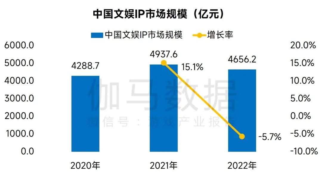 2022年中国文娱IP市场规模4656.2亿元,同比下降5.7%