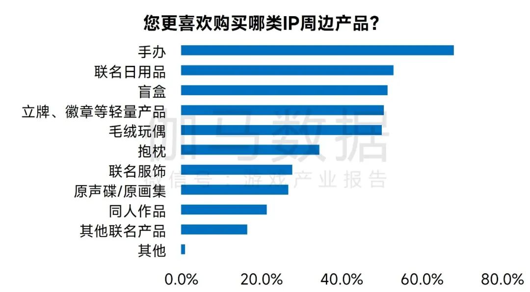 在各类IP周边产品中,手办类产品为最受IP用户喜欢的品类,在购买过周边的用户中,近七成倾向于购买手办类产品,其次为日用品、盲盒、小型周边、毛绒玩具等价格相对便宜的周边产品。