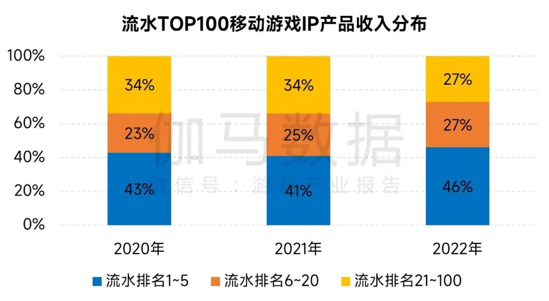 从流水TOP100移动游戏IP产品收入分布来看,流水排名前五的产品流水合计占比达46%,流水TOP20产品流水合计占比突破70%,相比于2021年,流水TOP20产品流水合计占比增长了7%。随着IP改编移动游戏市场竞争的加剧,IP竞争逐渐向全产业链发展。在产业链上游,游戏企业开始加大投入,探索并尝试原创IP的研发,扩大自身价值创造能力;在产业链中下游,游戏企业也开始不断拓展IP衍生品布局。从实物产品到数字衍生品,从线下主题活动到跨领域联动,移动游戏IP市场的竞争已不局限于游戏市场内,开始向更多文化产业领域进行布局。