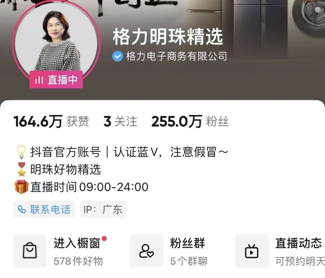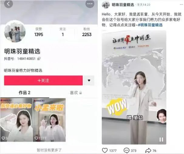 之后,格力又在抖音上开通了“明珠羽童精选”账号,并于11月22日发布了第一条视频,在之后的半年时间内,该账号粉丝量便增长至230W。除了在短视频中出镜讲解格力产品外,孟羽童还会频繁现身直播间带货,“明珠羽童精选”也一度成为格力账号矩阵中热度最高的账号。