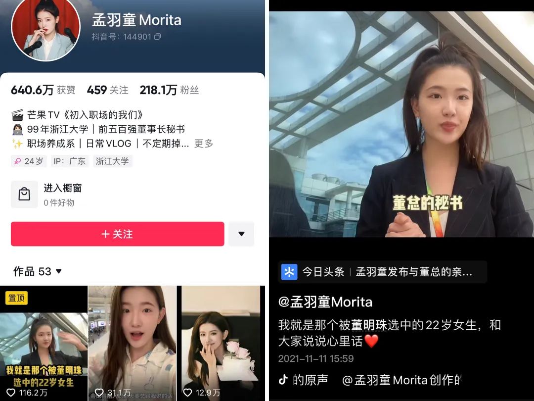 “我就是那个被董明珠选中的22岁女孩,和大家说说心里话。”在孟羽童的抖音账号上,这条点赞量高达116.2W的“定情视频”依然放在置顶位置,无声地昭示着二人曾有过的甜蜜期。