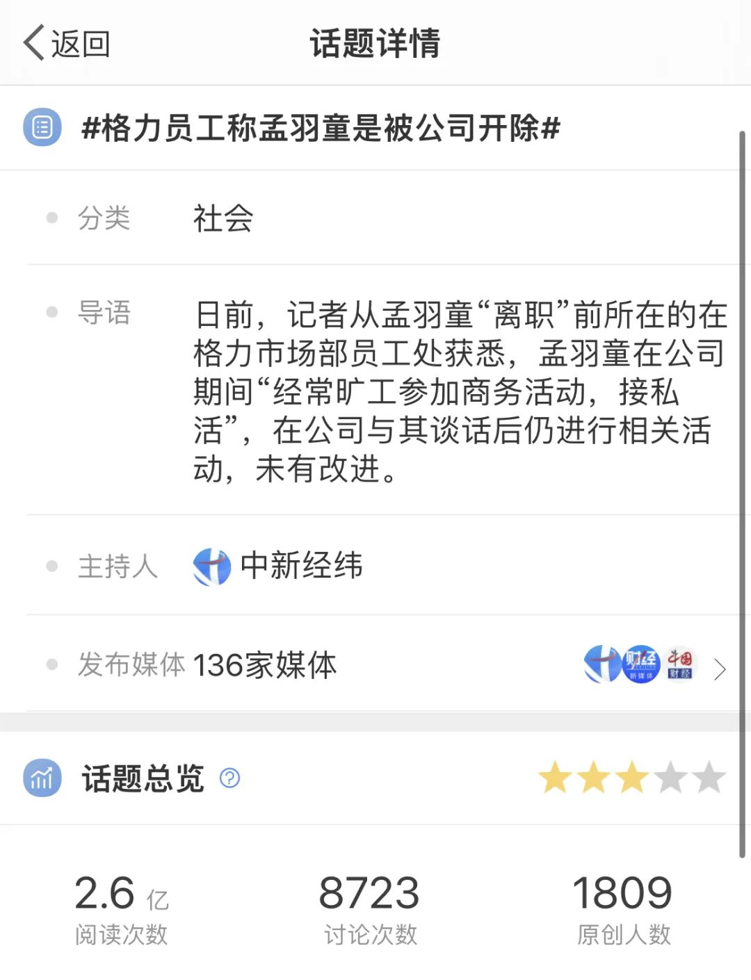 5月16日,一条#格力员工称孟羽童是被公司开除#的新闻冲上微博热搜,让孟羽童的离职事件再度发酵。