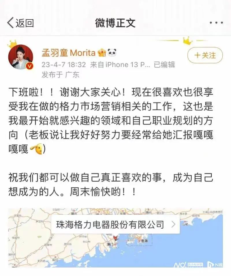 与此同时,董明珠在采访中提到孟羽童时,口径也已发生改变,她称孟羽童已经转去市场营销岗,不再担任自己的秘书。对此,孟羽童快速在微博上作出回应,表示自己最开始感兴趣的领域和职业规划的方向就是市场营销相关的工作,目前非常享受这种状态。